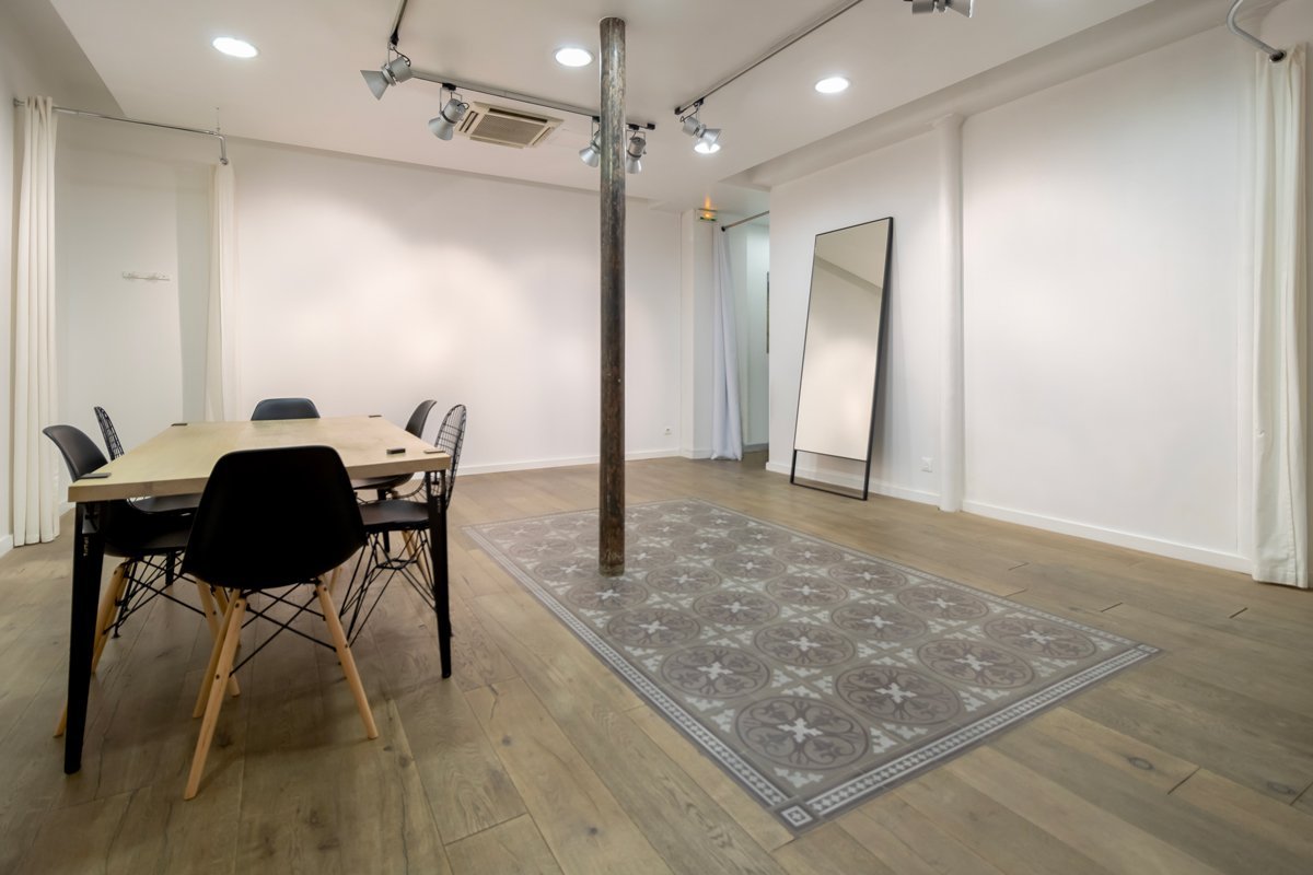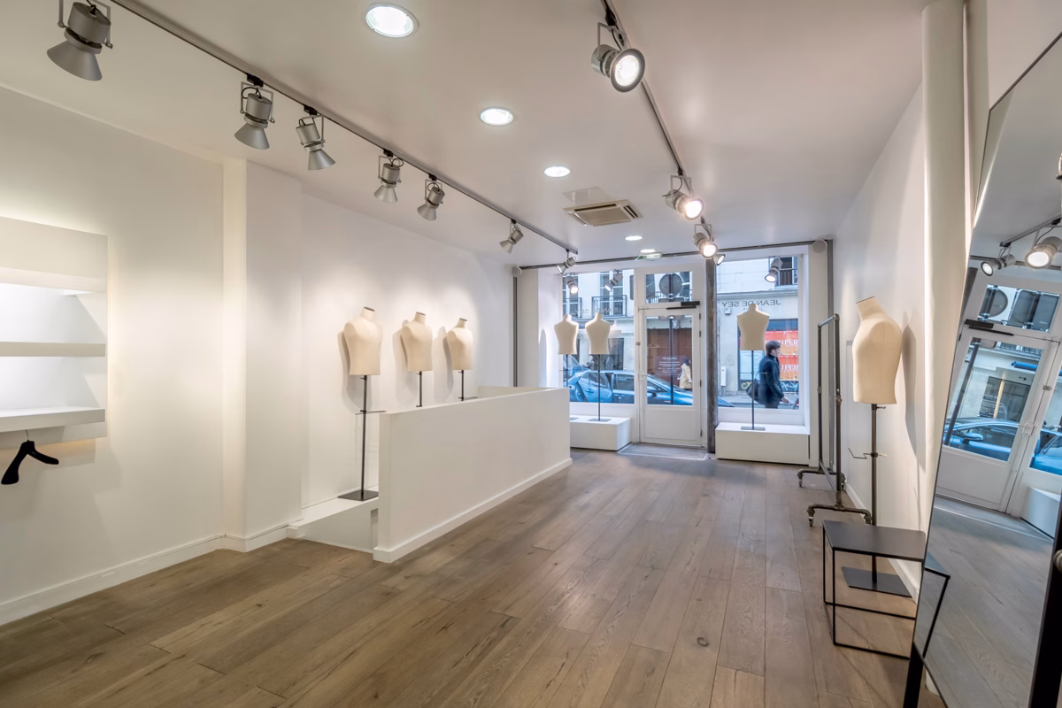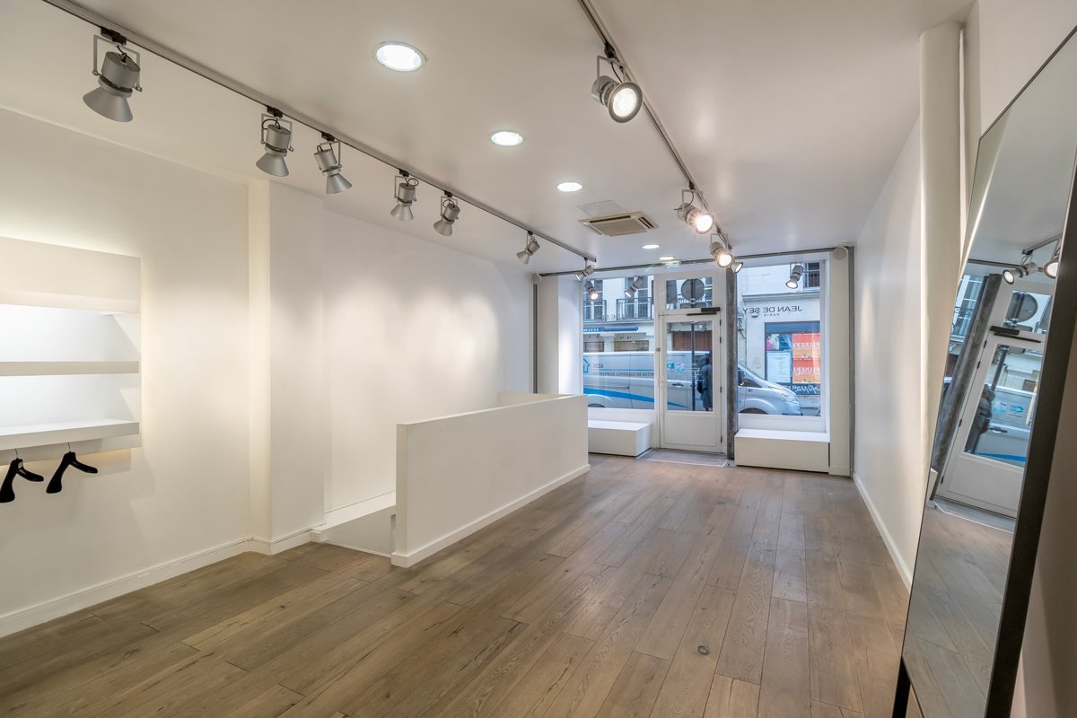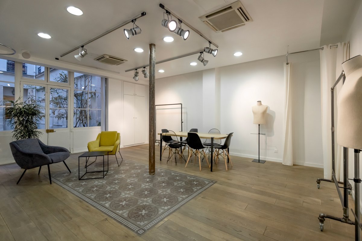 La configuration des lieux en deux espaces distincts et communicants est un atout majeur pour recevoir plusieurs clients en même temps, créer plusieurs atmosphères ou tout simplement pour mutualiser l’espace d’exposition. L’un permet une visibilité maximale avec une large vitrine sur rue. L’autre offre un espace plus intimiste avec vue sur cour typique du Marais. Le parquet en bois massif agrémenté d’élégants carreaux de ciment, vestiges d’un ancien temps, donnent à ce lieu contemporain un cachet incroyable. Eclairage design et lumière du jour favorisent la mise en valeur des articles exposés et améliorent considérablement le confort de travail.
