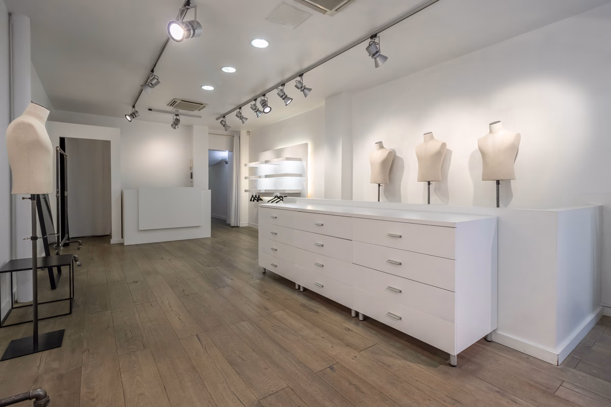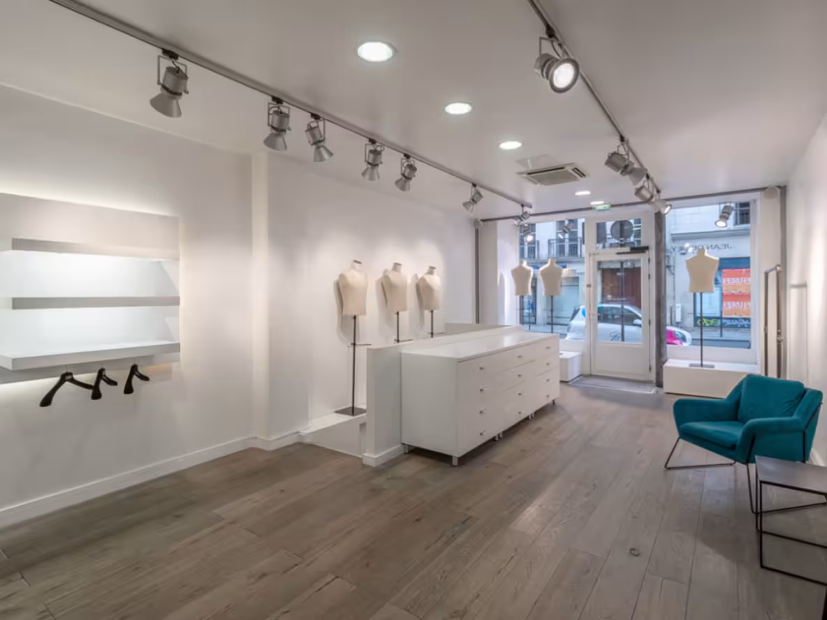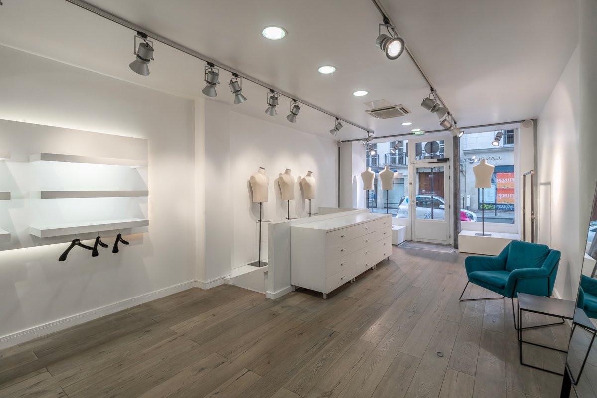 La configuration des lieux en deux espaces distincts et communicants est un atout majeur pour recevoir plusieurs clients en même temps, créer plusieurs atmosphères ou tout simplement pour mutualiser l’espace d’exposition. L’un permet une visibilité maximale avec une large vitrine sur rue. L’autre offre un espace plus intimiste avec vue sur cour typique du Marais. Le parquet en bois massif agrémenté d’élégants carreaux de ciment, vestiges d’un ancien temps, donnent à ce lieu contemporain un cachet incroyable. Eclairage design et lumière du jour favorisent la mise en valeur des articles exposés et améliorent considérablement le confort de travail.